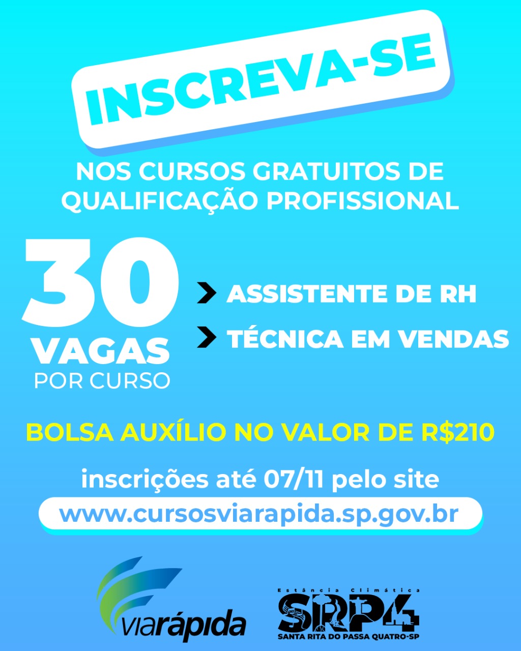 A Prefeitura Municipal de Santa Rita do Passa Quatro, por meio do Departamento de Turismo, e em parceria com o Governo do Estado de São Paulo, disponibiliza para a população santarritense os cursos de Assistente de RH e Técnica em Vendas, com início programado para o dia 16 de novembro de 2021, de segunda à sexta das 19h às 22h, por 16 dias. Mas atenção, os cursos possuem somente 30 vagas cada.