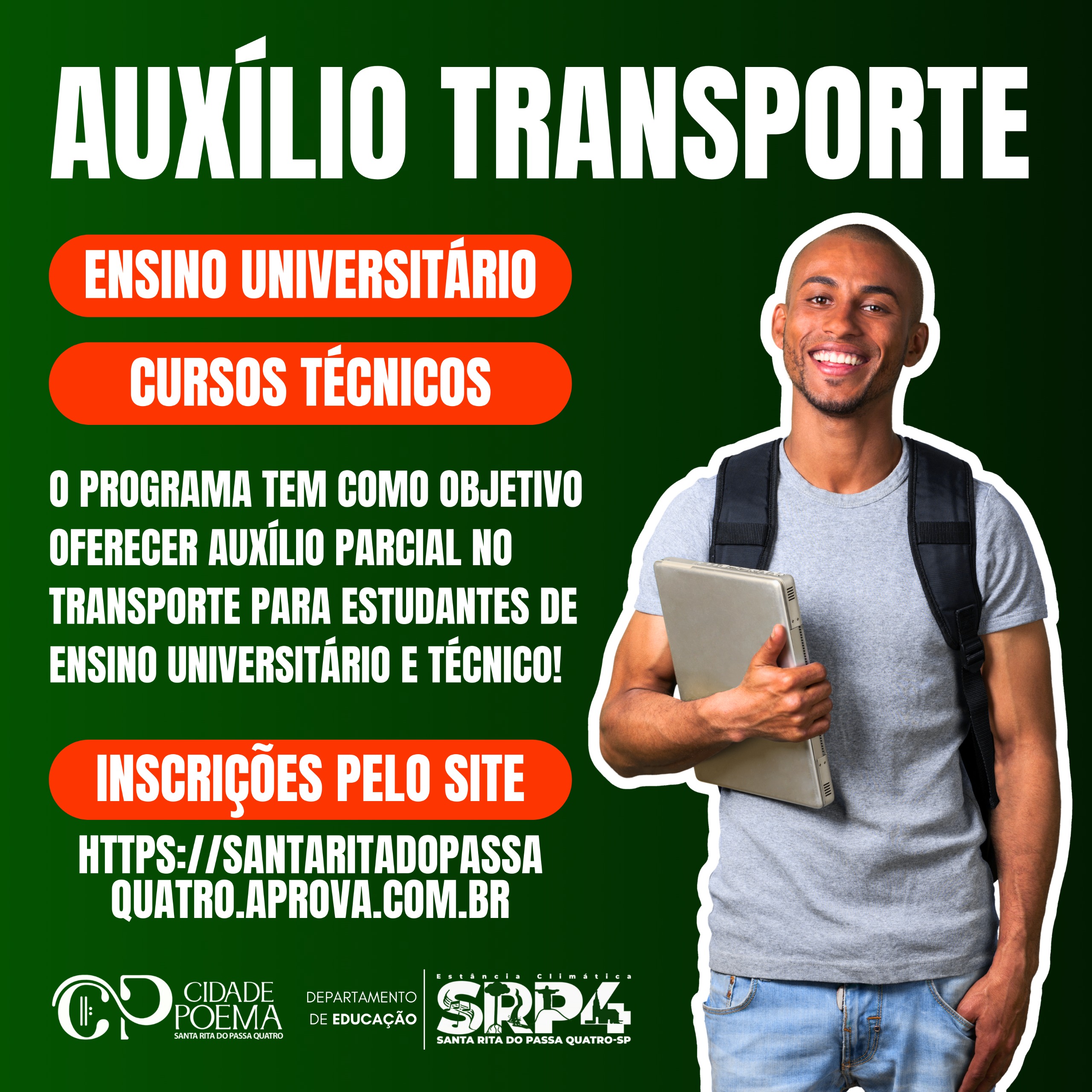 A Prefeitura de Santa Rita do Passa Quatro informa que as Solicitações de Auxílio Transporte 2025 para Ensino Universitário ou Curso Técnico já podem ser renovadas ou realizadas pelo Sistema APROVA!