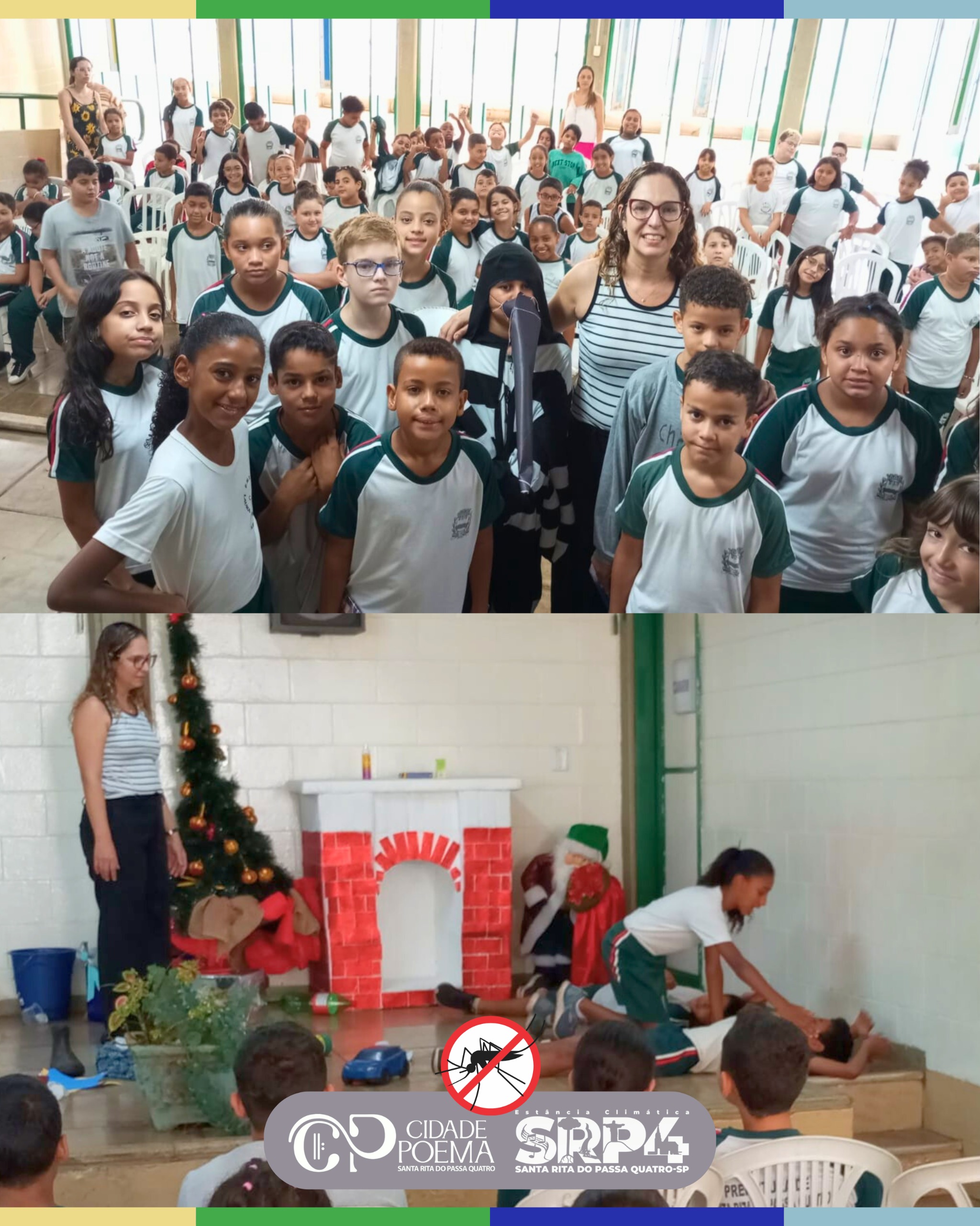 Os alunos do 5º ano B criaram e apresentaram uma peça teatral que destacou a importância da prevenção, abordando a limpeza dos quintais, eliminação de criadouros e cuidados essenciais para evitar a proliferação do mosquito Aedes Aegypti.