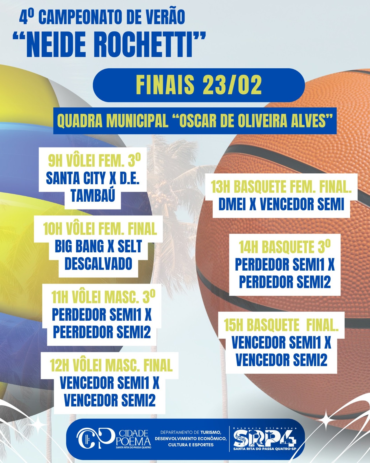 Chegamos às semifinais e finais dessa grande disputa! No dia 22/02, teremos partidas emocionantes que definirão os finalistas do vôlei e basquete. Já no dia 23/02, os grandes campeões serão coroados na Quadra Municipal “Oscar de Oliveira Alves”.