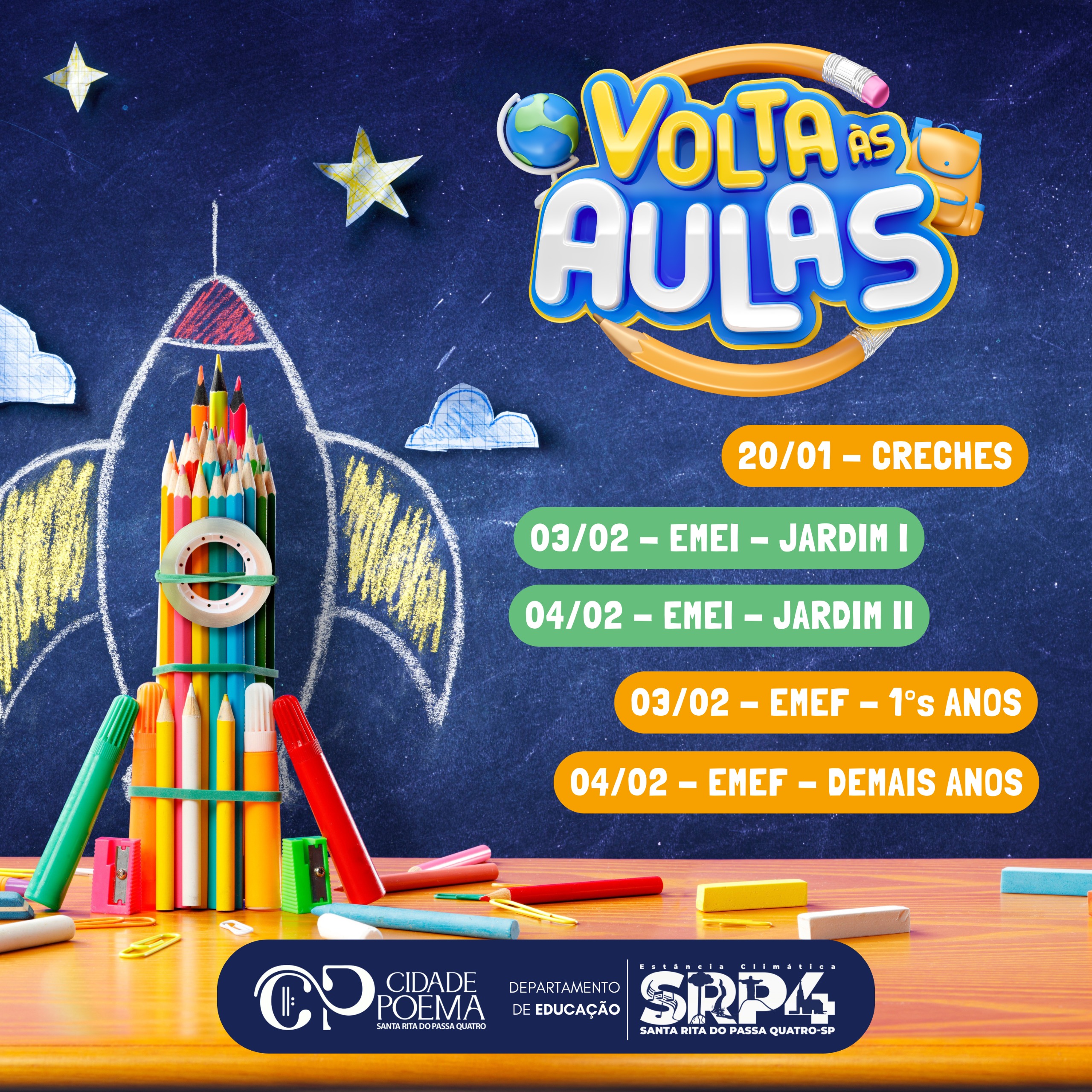 Atenção, pais e responsáveis! Já estamos nos preparando para receber nossos alunos nas creches e escolas da rede municipal de Santa Rita do Passa Quatro. Confira as datas de início das aulas: