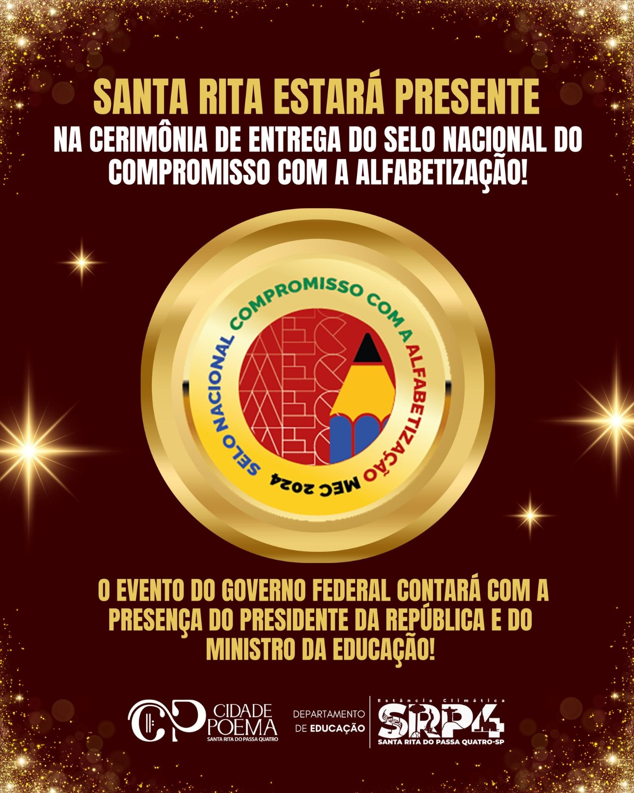 Agora, reafirmando o compromisso e dedicação de nossos educadores, gestores e alunos, Santa Rita do Passa Quatro foi convidada, representada pelo Prefeito Municipal Marcelo Simão, para a Cerimônia de Entrega do Selo Nacional do Compromisso com a Alfabetização. O evento contará com a presença do Presidente da República, Luiz Inácio Lula da Silva, e do Ministro da Educação, Camilo Santana, e acontecerá no dia 10 de fevereiro de 2025, no Centro Internacional de Convenções do Brasil – CICB.