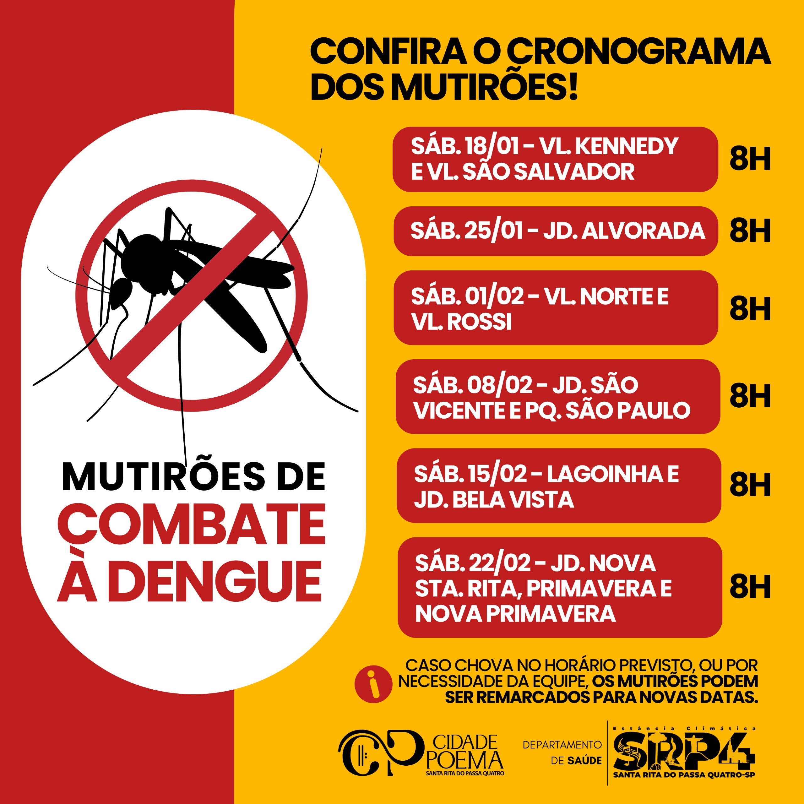 ⚠️ Caso chova no horário previsto, ou por necessidade da equipe, os mutirões podem ser remarcados para novas datas.