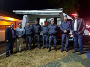 O prefeito junto aos policiais na base móvel da PM montada logo na entrada da Praça (AssCom/Divulgação)