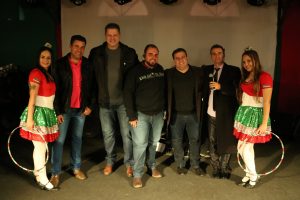 O prefeito e equipe do Departamento de Turismo com o cantor Ivano Italianíssimo e banda (AssCom/Divulgação)