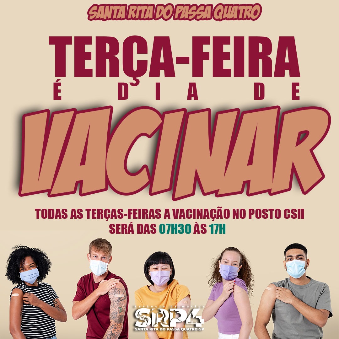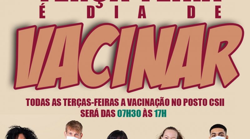 Toda terça-feira terá horário estendido para vacinação da primeira e segunda dose contra a Covid-19. Mas atenção, o horário estendido vale somente para o Posto CSII, das 07:30 às 17:00.