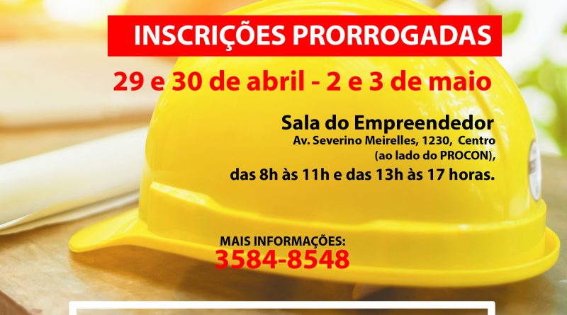 Originalmente com 20 vagas, o programa ampliou para 25 e as inscrições poderão ser feitas a partir desta segunda-feira (29/4), seguindo na terça (30/4) e na quinta e sexta-feira (2 e 3/5). Os candidatos devem se dirigir à Sala do Empreendedor, que fica na Av. Severino Meirelles, 1230, Centro (ao lado do PROCON), no horário das 8h às 11h e das 13h às 17 horas.