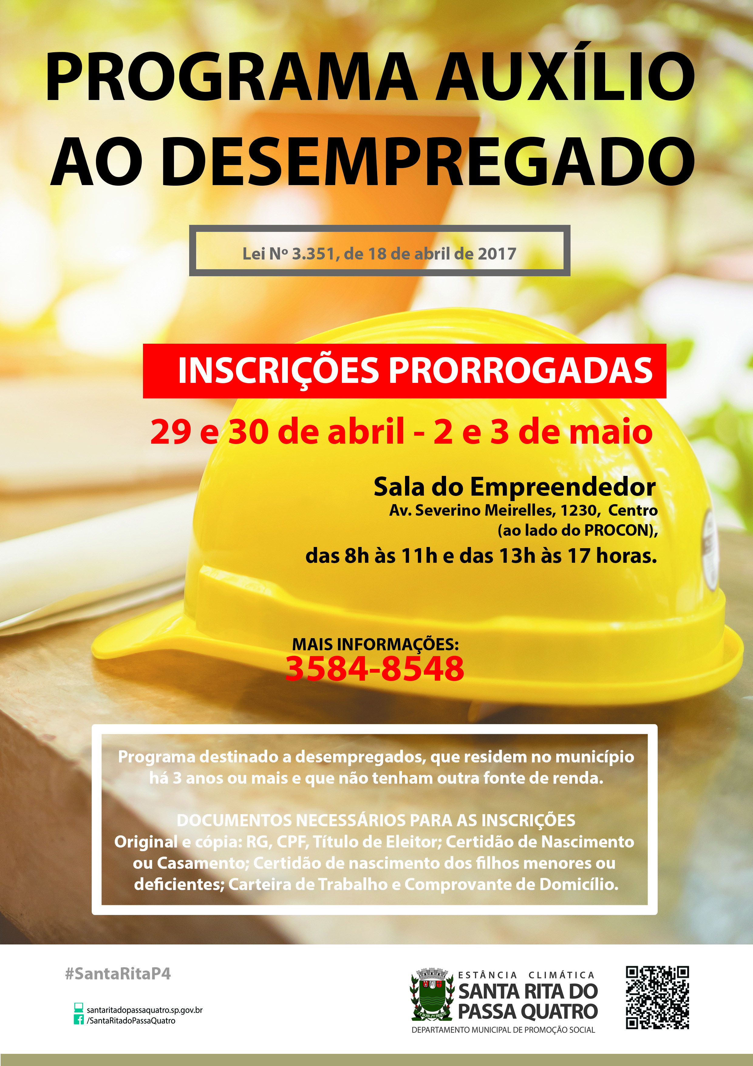 A Prefeitura Municipal de Santa Rita do Passa Quatro, através do Departamento de Assistência e Desenvolvimento Social, prorrogou o prazo de inscrições e aumentou o número de vagas da segunda etapa do Programa Auxílio ao Desempregado.